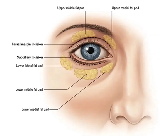 - Then I remove fat from the compartments around the eye to reduce the herniation that pushes the lid forward.